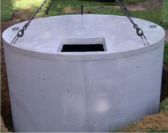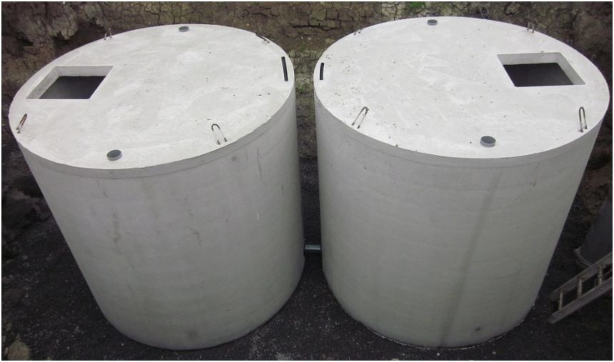 (Le dessus de la cuve de 10 M3 offre: 1 trou de visite, 2 manchons pour l’alimentation et le trop-plein, 1 tuyau pour l’aspiration).